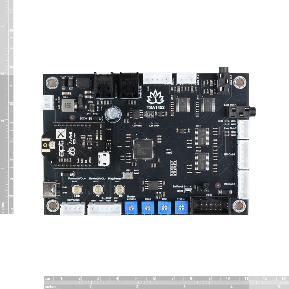 TSA1452B is an enhanced Bluetooth + DSP board with an AudioB I2S v3 module that supports Apt-X. It can be powered by a USB-C cable or any DC9V-30V power supply. You can pair it with a mobile phone or a computer (etc). Power the board, use your phone or PC (etc) to search for a new Bluetooth device. The module will appear as "TSA1452B". You don't need a PIN, pair it and then you can play music.